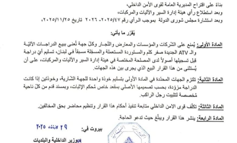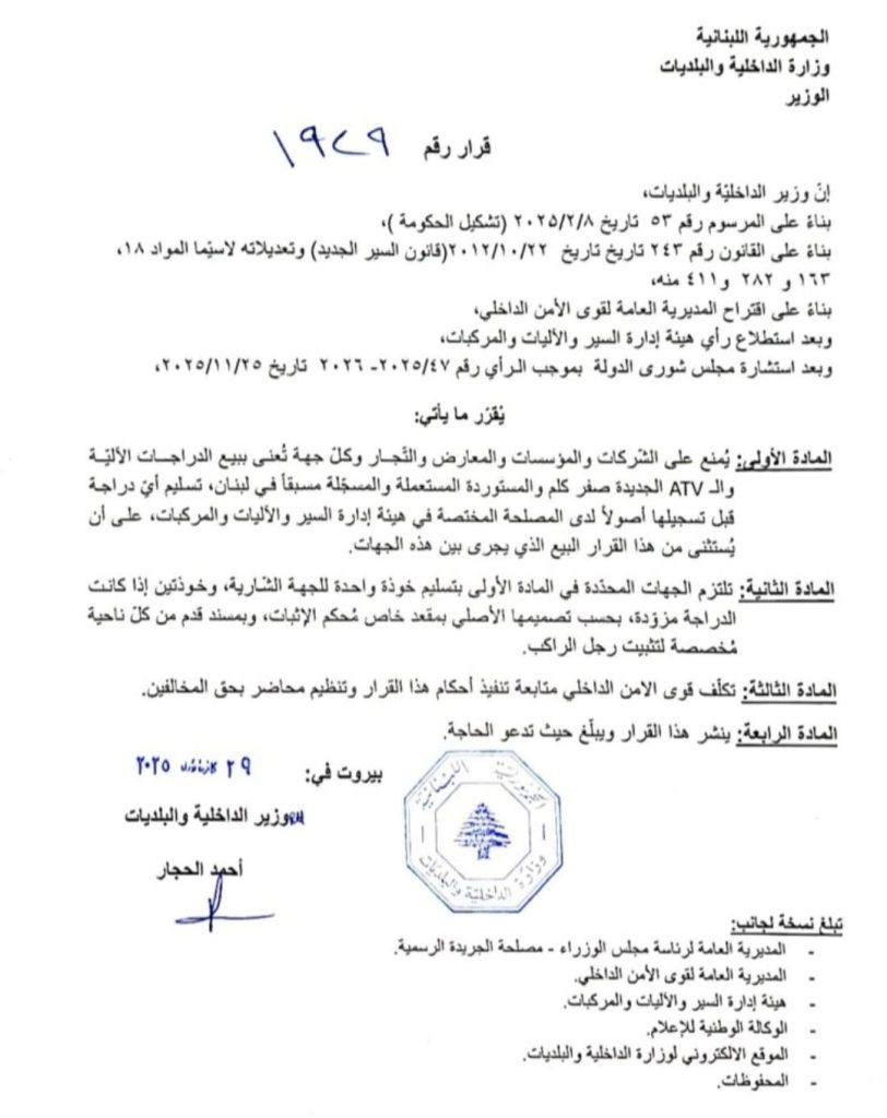 صدر عن وزير الداخلية والبلديات أحمد الحجار قرار بشأن منع شركات ومؤسسات ومعارض وتجار وكلّ جهة تُعنى ببيع الدراجات الآلية و/أو الـATV الجديدة منها و/أو المستوردة المستعملة في لبنان، تسليم أي دراجة قبل تسجيلها أصولًا لدى المصلحة المختصة في هيئة إدارة السير والآليات والمركبات وإلزامها بتسليم خوذة للجهة الشارية.