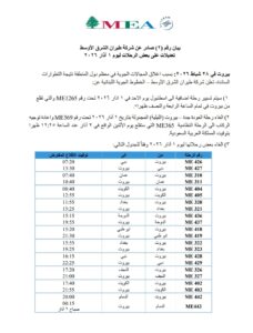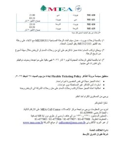 1) سيتم تسيير رحلة اضافية الى اسطنبول يوم الاحد في ١ اذار ٢٠٢٦ تحت رقم ME1265 والتي تقلع من بيروت في تمام الساعة الرابعة والنصف ظهرا״.