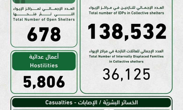 – العدد الإجمالي للنازحين في مراكز الإيواء: 138,532