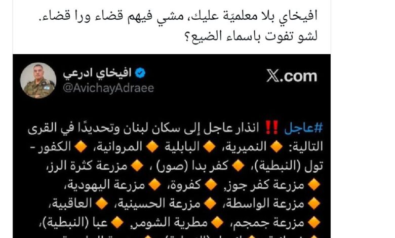 كتبت نادين بركات في منشور أدرعي عبر منصة “إكس”، منتقدة أسلوبه في سرد أسماء القرى، وكتبت : بدو نص ساعة الواحد يقرأ إذا ضيعته مذكورة.. افيخاي بلا معلميّة عليك، مشي فيهم قضاء ورا قضاء. لشو تفوت باسماء الضيع؟
